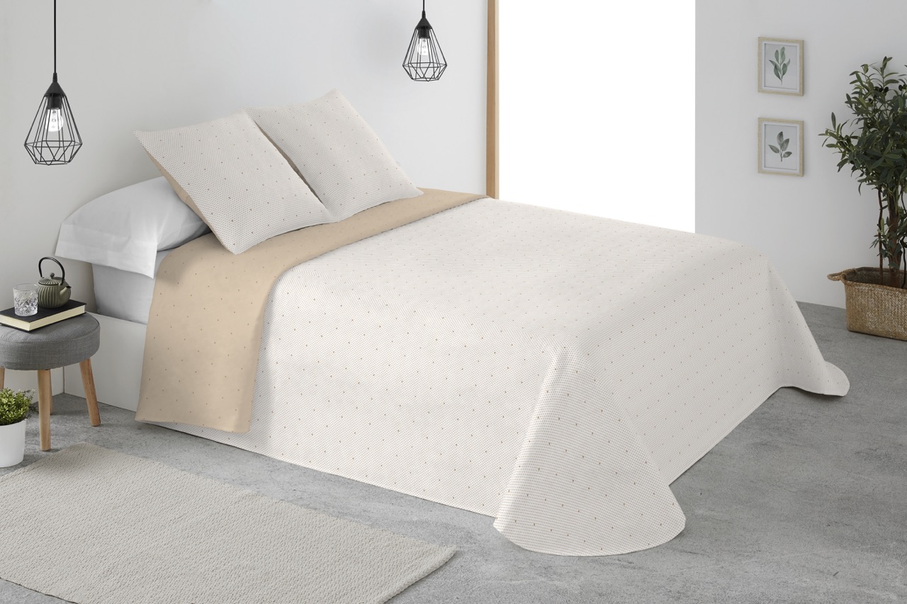 Colcha actual, con un acabado suave. Nuestra colección de colchas Bordadas Suaves, son una muestra de elegancia, mostrando un acabado fino y actual en su anverso y un coordinado con un toque de color en su reverso (en gris y arena).